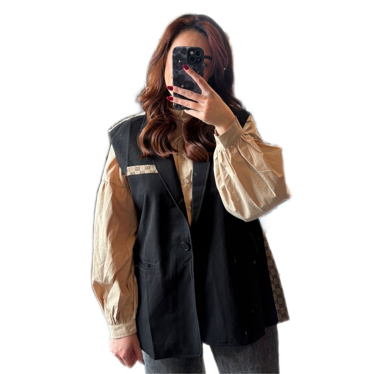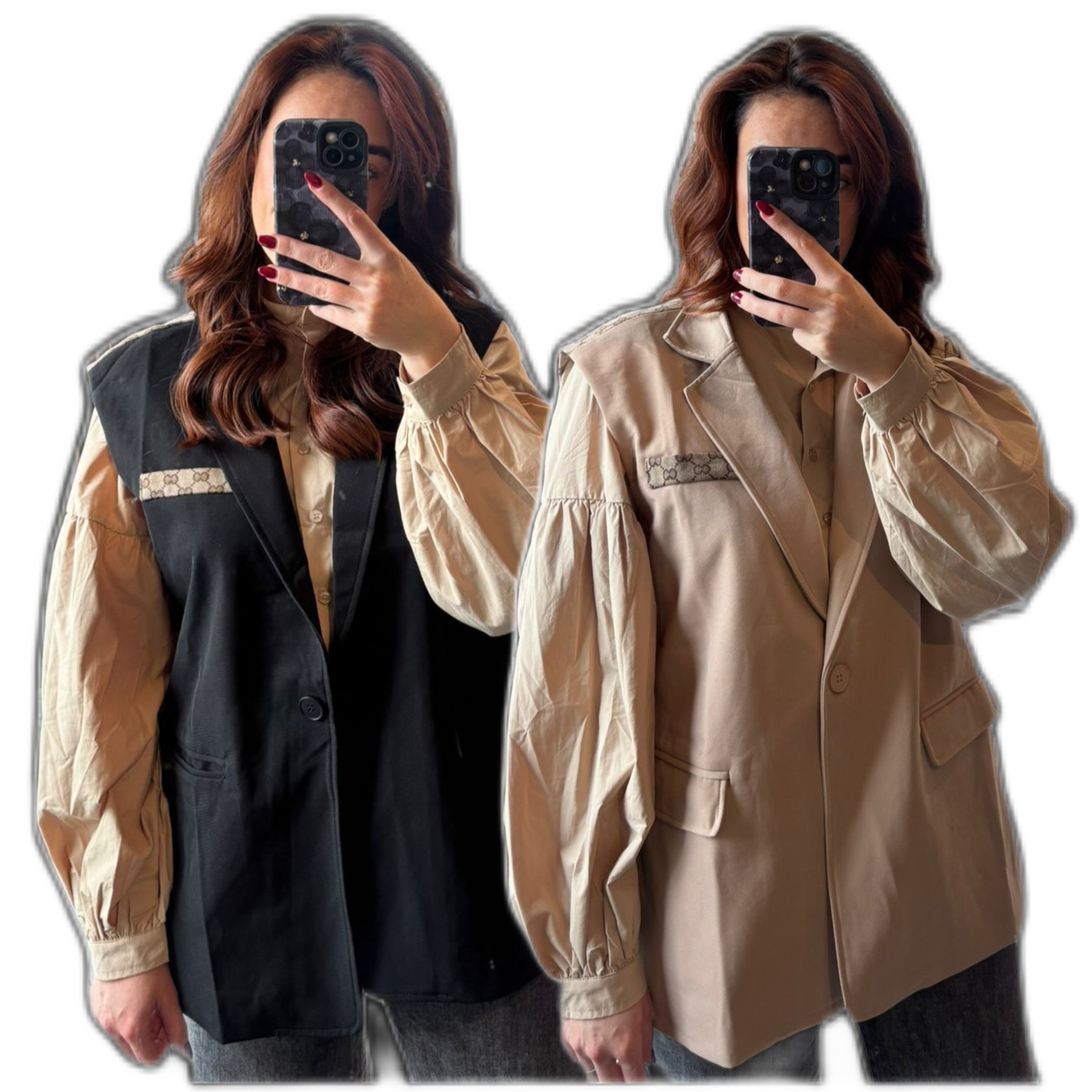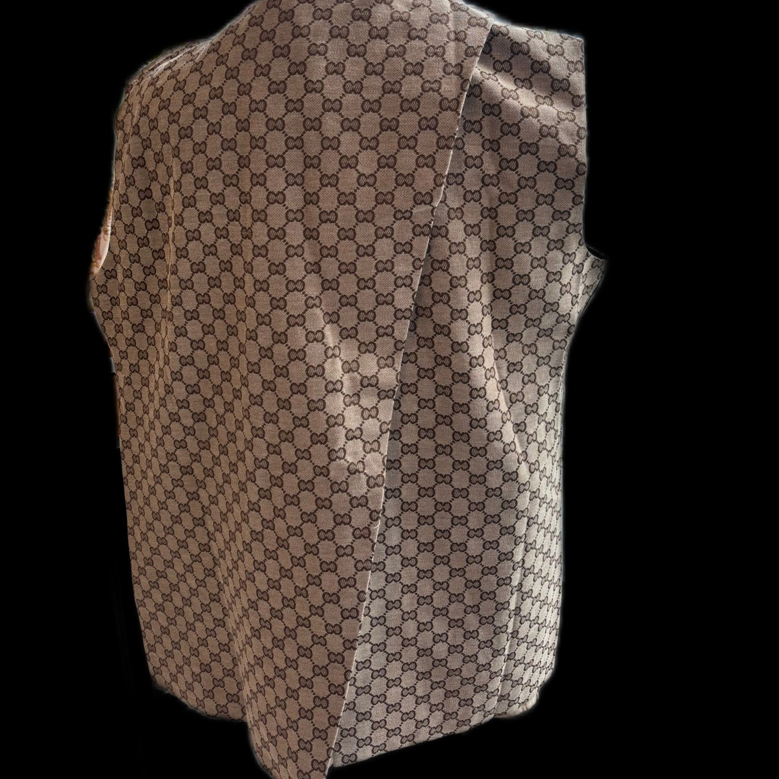 Dit gilet heeft een geblokte achterkant bruin-beige van kleur en een schuine opslaande bies aan de achterkant. De voorkant is zwart of beige Merk: Azzurro.